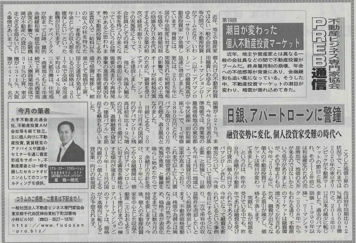 ビルオーナー、不動産会社向けの業界紙である「週刊ビル経営」にて、当協会登録専門家によるコラムを毎月連載させて頂いております。 今回は当協会登録専門家でリアル・スター・コラボレーション株式会社代表取締役の星龍一朗氏が「潮目… 続きを読む »