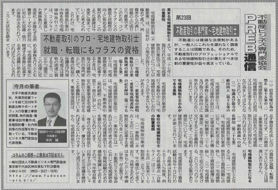 ビルオーナー、不動産会社向けの業界紙である「週刊ビル経営」にて、当協会登録専門家によるコラムを毎月連載させて頂いております。 今回は当協会登録専門家で行政書士の中沢誠氏が「不動産取引の専門家~宅地建物取引士」と題したコラ… 続きを読む »