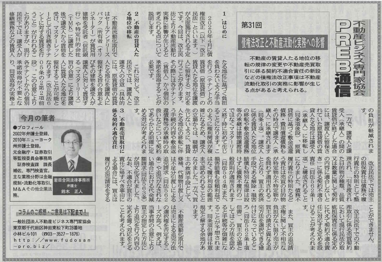 ビルオーナー、不動産会社向けの業界紙である「週刊ビル経営」にて、当協会登録専門家によるコラムを毎月連載させて頂いております。 今回は当協会登録専門家で弁護士の鈴木正人氏が「債権法改正と不動産流動化実務への影響」と題したコ… 続きを読む »