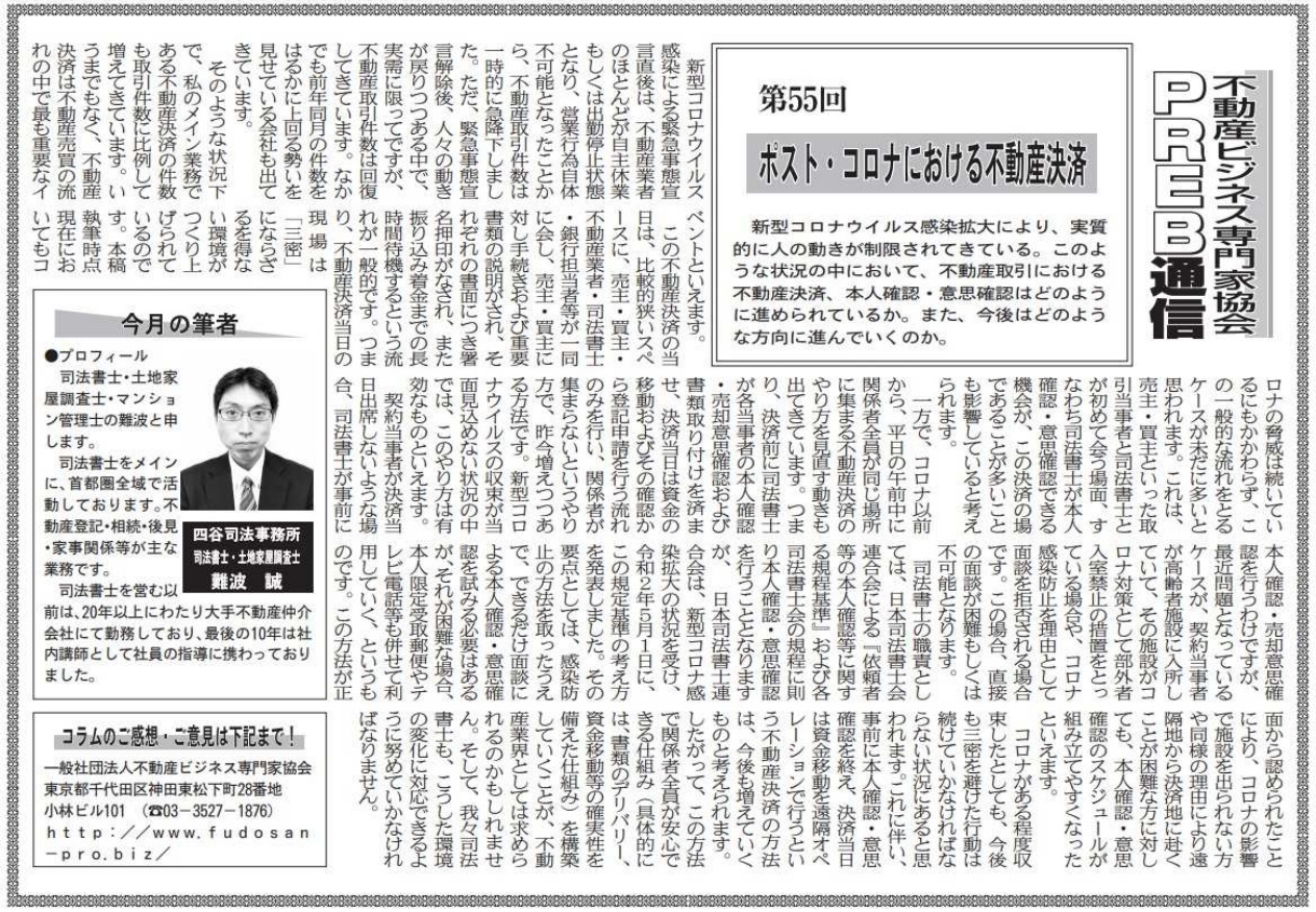 ビルオーナー、不動産会社向けの業界紙である「週刊ビル経営」にて、当協会登録専門家によるコラムを毎月連載させて頂いております。 今回は当協会登録専門家で司法書士の難波誠氏が「ポスト・コロナにおける不動産決済」と題したコラム… 続きを読む »