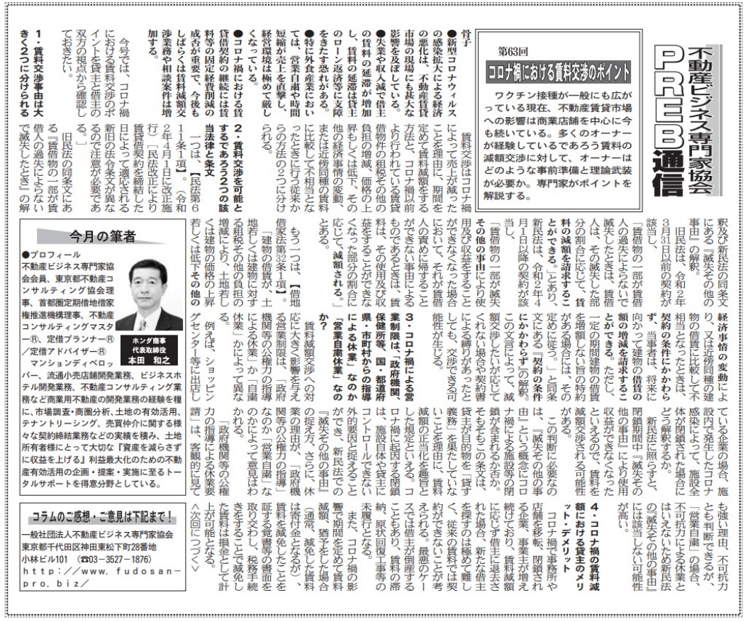 ビルオーナー、不動産会社向けの業界紙である「週刊ビル経営」にて、当協会登録専門家によるコラムを毎月連載させて頂いております。 今回は当協会登録専門家でホンダ商事株式会社代表取締役の本田和之氏が「コロナ禍における賃料交渉の… 続きを読む »