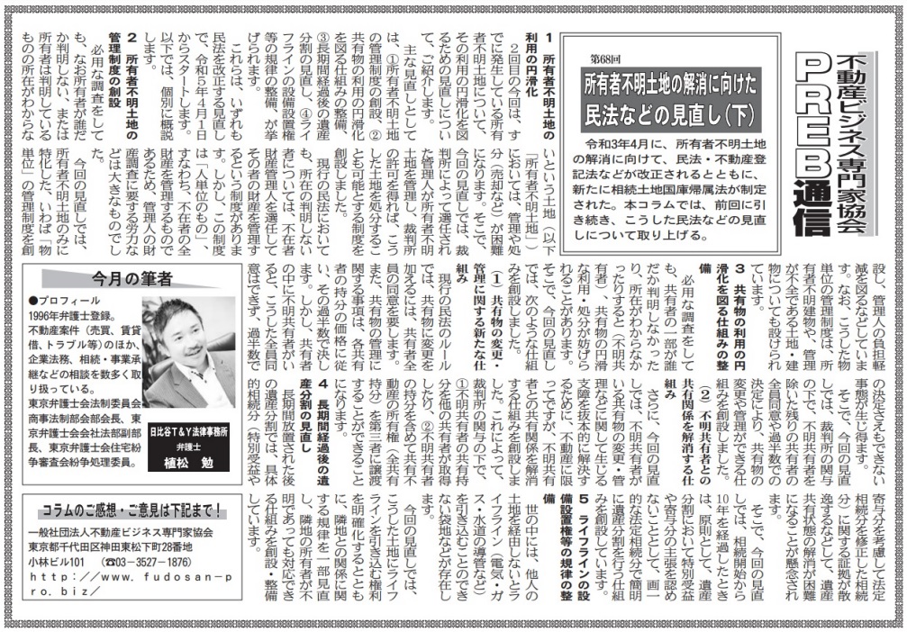ビルオーナー、不動産会社向けの業界紙である「週刊ビル経営」にて、当協会登録専門家によるコラムを毎月連載させて頂いております。 今回は当協会登録専門家で弁護士の植松勉氏が「所有者不明土地の解消に向けた民法などの見直し(下)… 続きを読む »