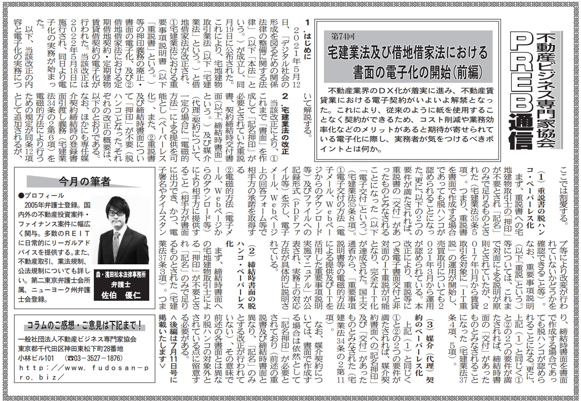 ビルオーナー、不動産会社向けの業界紙である「週刊ビル経営」にて、当協会登録専門家によるコラムを毎月連載させて頂いております。今回は当協会登録専門家で弁護士の佐伯優仁氏が「宅建業法及び借地借家法における書面の電子化の開始(… 続きを読む »