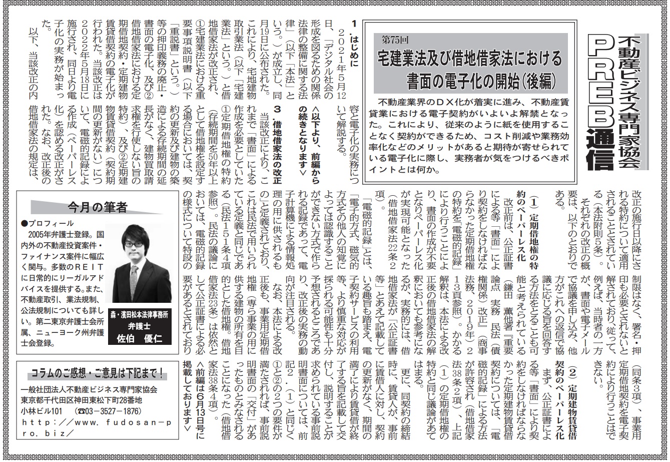 ビルオーナー、不動産会社向けの業界紙である「週刊ビル経営」にて、当協会登録専門家によるコラムを毎月連載させて頂いております。 今回は当協会登録専門家で弁護士の佐伯優仁氏が「宅建業法及び借地借家法における書面の電子化の開始… 続きを読む »