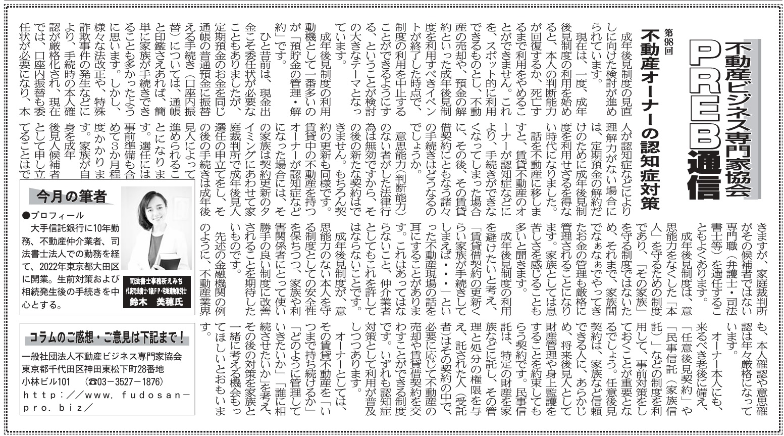 今回は当協会登録専門家で司法書士の鈴木美穂氏が「不動産オーナーの認知症対策」と題したコラムを執筆いたしました。 今後も様々な切り口でコラムを書いてまいりますのでご期待ください。 執筆者紹介 鈴木美穂 司法書士事務所えみち… 続きを読む »