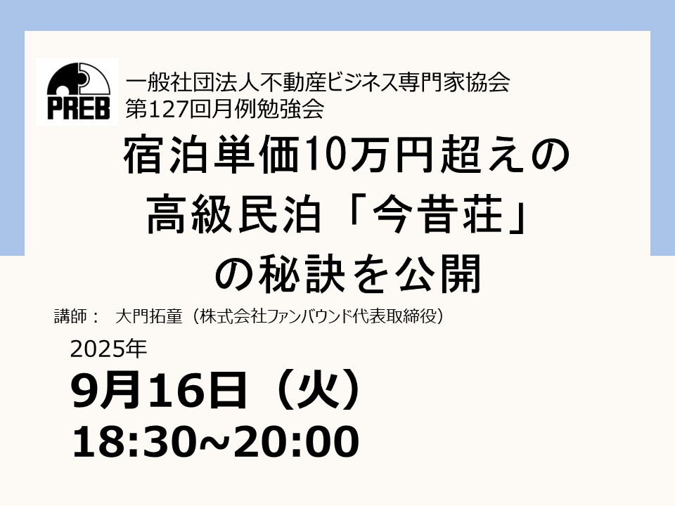 2025年9月に開催予定の第127回月例勉強会は、株式会社ファンバウンド代表取締役の大門拓童氏を講師としてお迎えし、「宿泊単価10万円超えの高級民泊『今昔荘』の秘訣を公開」と題してお話しいただきます。 概要 近年、訪日外… 続きを読む »