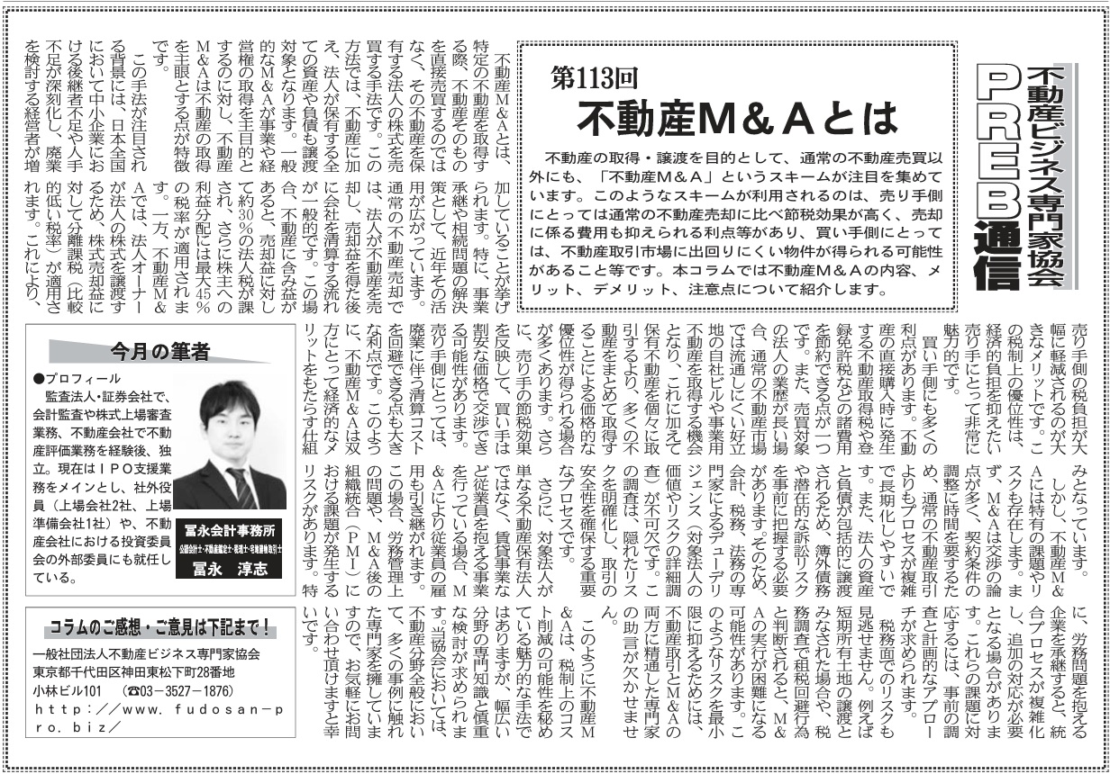 今回は当協会登録専門家で公認会計士・税理士・不動産鑑定士の冨永淳志氏が「不動産M&Aとは」と題したコラムを執筆いたしました。 今後も様々な切り口でコラムを書いてまいりますのでご期待ください。 執筆者紹介 冨永淳志 冨永会… 続きを読む »