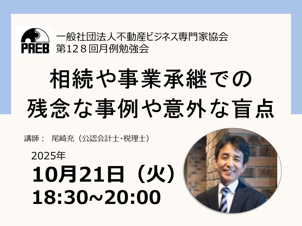 一般社団法人不動産ビジネス専門家協会では、毎月第三火曜日の夜に勉強会(ミニセミナー)を開催しております。 近年、相続や事業承継の重要性が更に高まる中で、残念な事例や意外な盲点に遭遇することがあります。 円滑な相続や事業承… 続きを読む »