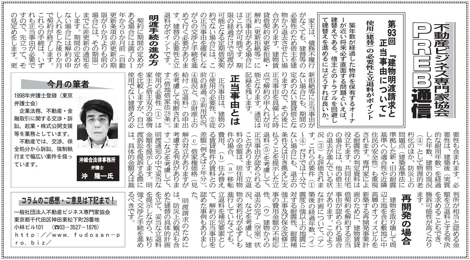 今回は当協会登録専門家で弁護士の沖隆一氏が「建物明渡請求と正当事由について」と題したコラムを執筆いたしました。 今後も様々な切り口でコラムを書いてまいりますのでご期待ください。 執筆者紹介 沖隆一 沖総合法律事務所弁護士… 続きを読む »