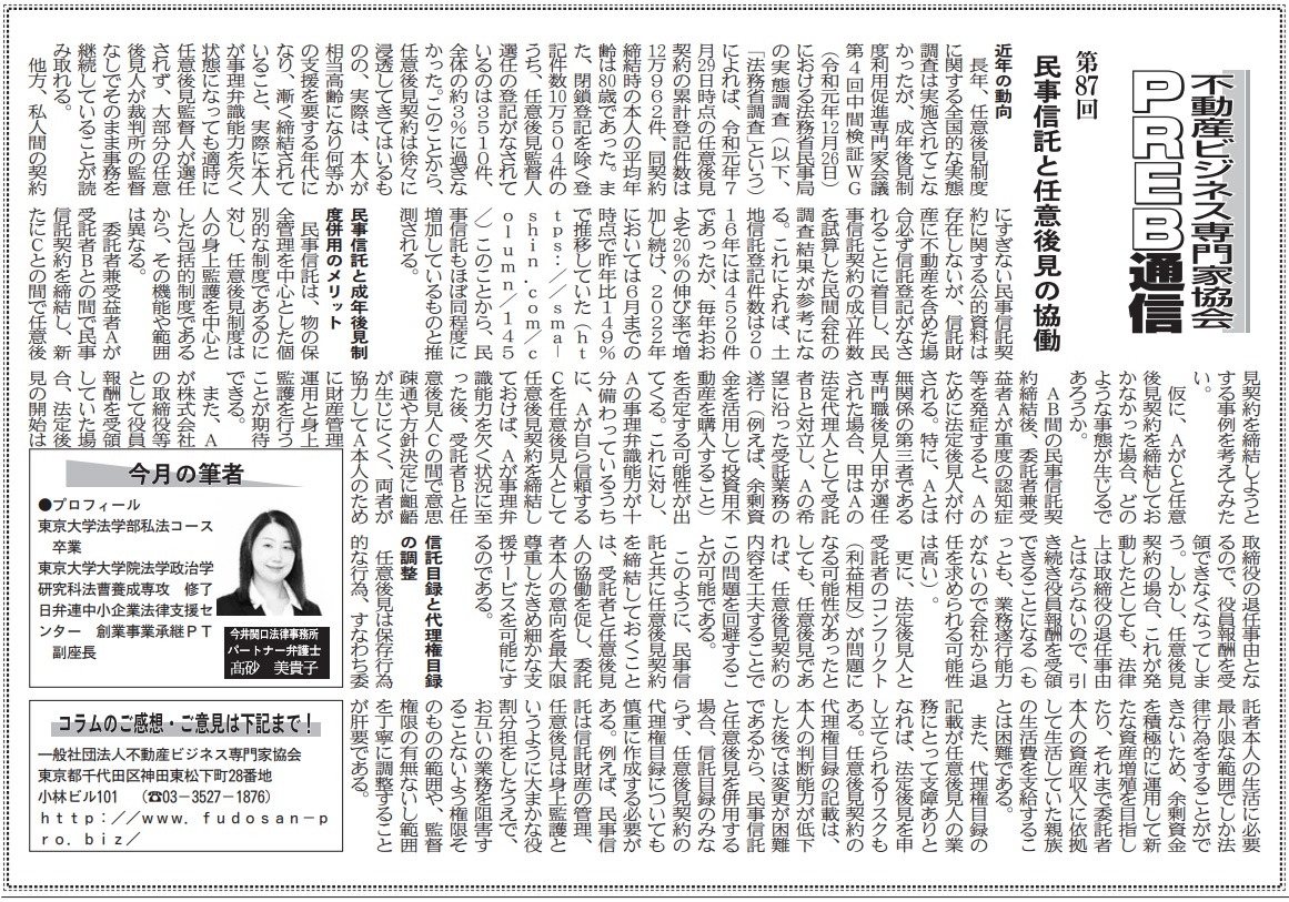 ビルオーナー、不動産会社向けの業界紙である「週刊ビル経営」にて、当協会登録専門家によるコラムを毎月連載させて頂いております。 今回は当協会登録専門家で弁護士の髙砂美貴子氏が「民事信託と任意後見の協働」と題したコラムを執筆… 続きを読む »