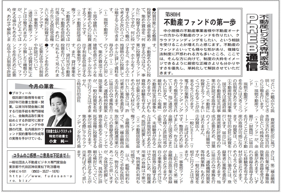 ビルオーナー、不動産会社向けの業界紙である「週刊ビル経営」にて、当協会登録専門家によるコラムを毎月連載させて頂いております。 今回は当協会登録専門家で行政書士の小倉純一氏が「不動産ファンドの第一歩」と題したコラムを執筆い… 続きを読む »