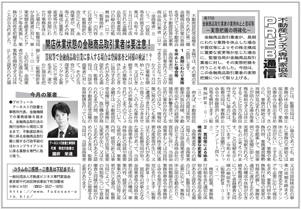 ビルオーナー、不動産会社向けの業界紙である「週刊ビル経営」にて、当協会登録専門家によるコラムを毎月連載させて頂いております。 今回は当協会登録専門家で行政書士の國府栄達氏が「金融商品取引業者の業務休止と買収等-実態把握の… 続きを読む »