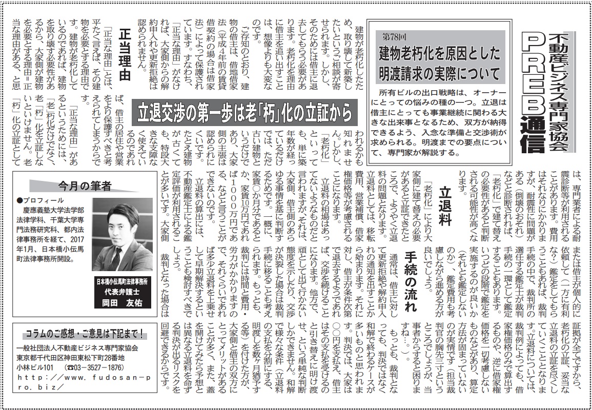 ビルオーナー、不動産会社向けの業界紙である「週刊ビル経営」にて、当協会登録専門家によるコラムを毎月連載させて頂いております。 今回は当協会登録専門家で弁護士の岡田友佑氏が「建物老朽化を原因とした明渡請求の実際について」と… 続きを読む »
