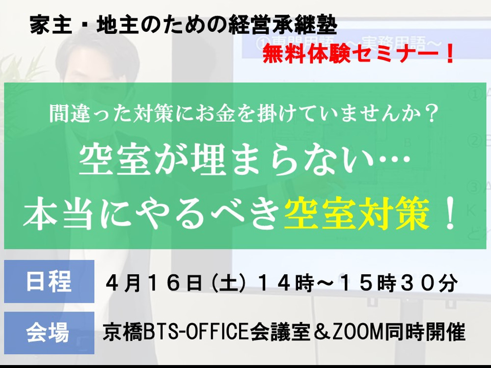 2022年4月16日に開催した無料セミナーは「空室が埋まらない…本当にやるべき空室対策!」と題し、当協会登録専門家の三好貴大氏が登壇いたしました。 概要 「空室対策」と聞くと、リノベーション工事や無料インターネットといっ… 続きを読む »