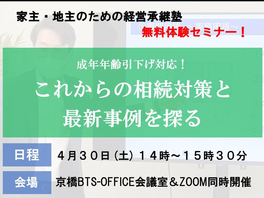 2022年4月30日に開催した無料セミナーは「成年年齢引下げ対応!これからの相続対策と最新事例を探る」と題し、当協会登録専門家で税理士の花光慶尚氏が登壇いたしました。 概要 毎年4月は様々な法改正が施行される時期ですが、… 続きを読む »