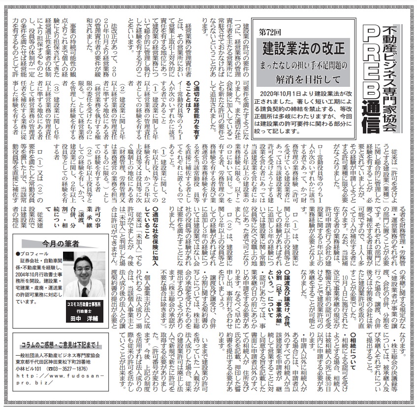 ビルオーナー、不動産会社向けの業界紙である「週刊ビル経営」にて、当協会登録専門家によるコラムを毎月連載させて頂いております。 今回は当協会登録専門家で行政書士の田中洋輔氏が「建設業法の改正~まったなしの担い手不足問題の解… 続きを読む »