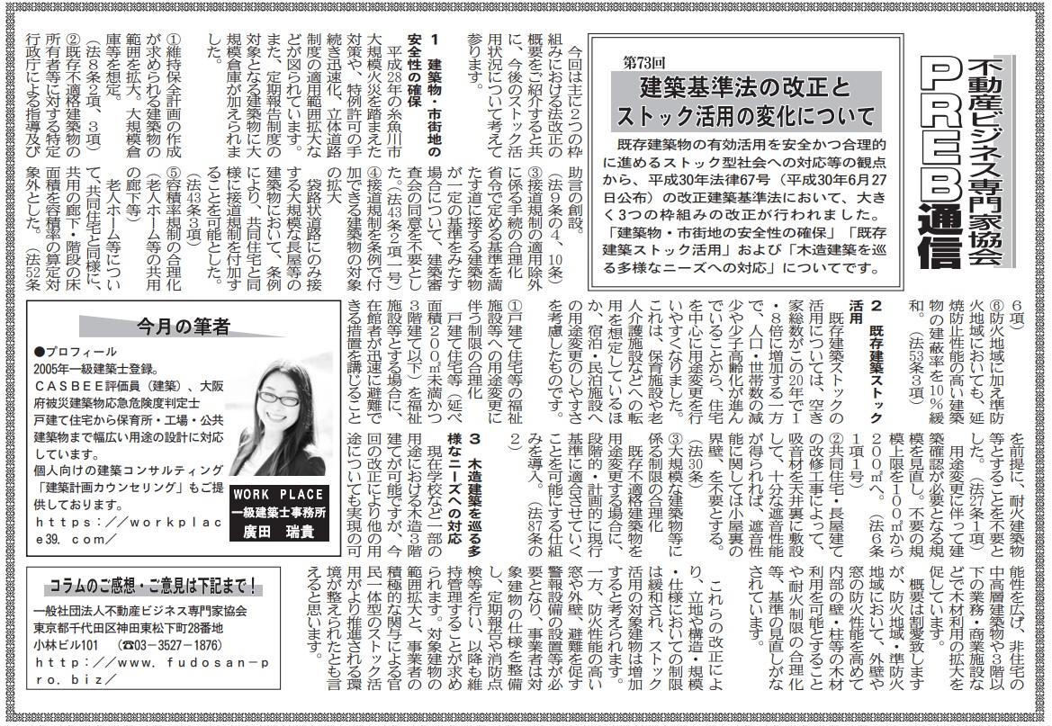 ビルオーナー、不動産会社向けの業界紙である「週刊ビル経営」にて、当協会登録専門家によるコラムを毎月連載させて頂いております。 今回は当協会登録専門家で一級建築士の廣田瑞貴氏が「建築基準法の改正とストック活用の変化について… 続きを読む »