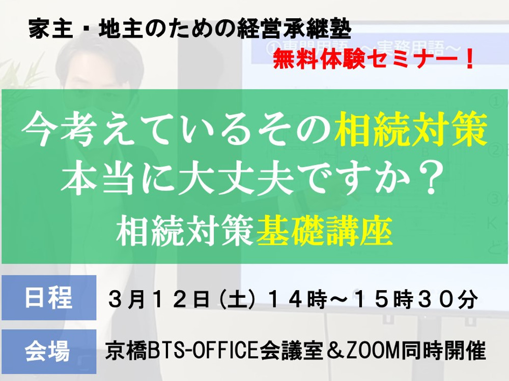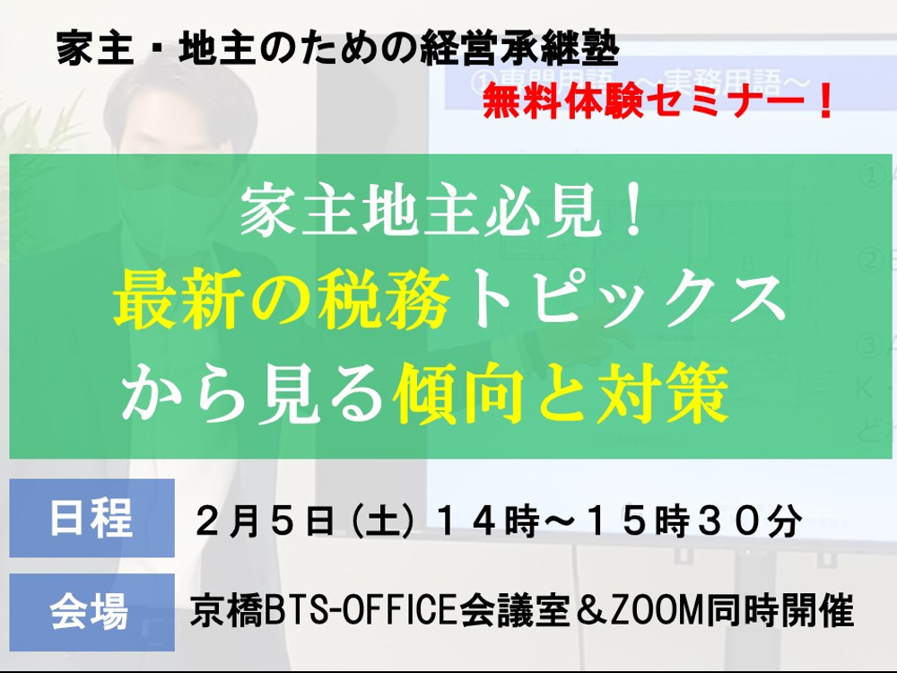 2022年2月5日に開催した無料セミナーは、「家主地主必見!最新の税務トピックスから見る傾向と対策」と題し、当協会登録専門家で税理士の花光慶尚氏が登壇いたしました。 概要 家主地主にとって、税金は悩みの種。その中でも相続… 続きを読む »
