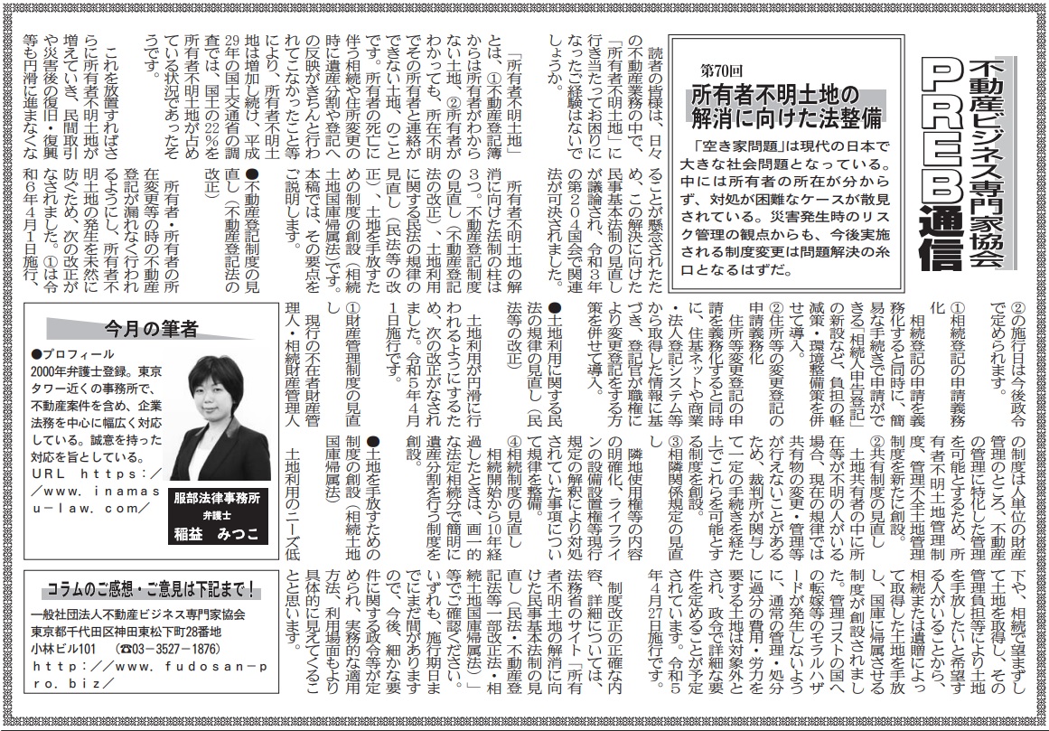 ビルオーナー、不動産会社向けの業界紙である「週刊ビル経営」にて、当協会登録専門家によるコラムを毎月連載させて頂いております。 今回は当協会登録専門家で弁護士の稲益みつこ氏が「所有者不明土地の解消に向けた法整備」と題したコ… 続きを読む »