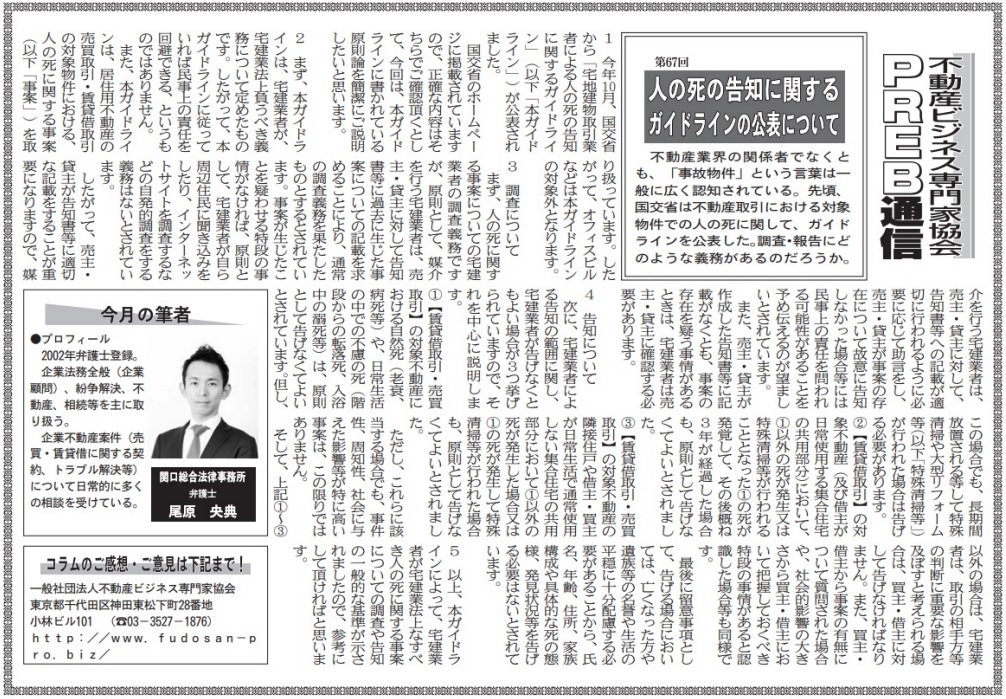 ビルオーナー、不動産会社向けの業界紙である「週刊ビル経営」にて、当協会登録専門家によるコラムを毎月連載させて頂いております。 今回は当協会登録専門家で弁護士の尾原央典氏が「人の死の告知に関するガイドラインの公表について」… 続きを読む »