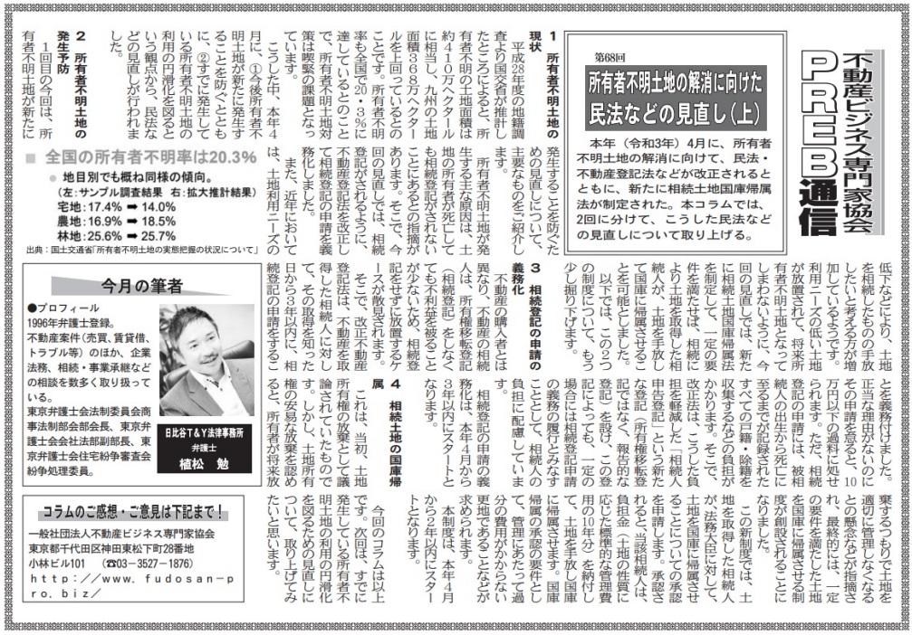ビルオーナー、不動産会社向けの業界紙である「週刊ビル経営」にて、当協会登録専門家によるコラムを毎月連載させて頂いております。 今回は当協会登録専門家で弁護士の植松勉氏が「所有者不明土地の解消に向けた民法などの見直し(上)… 続きを読む »