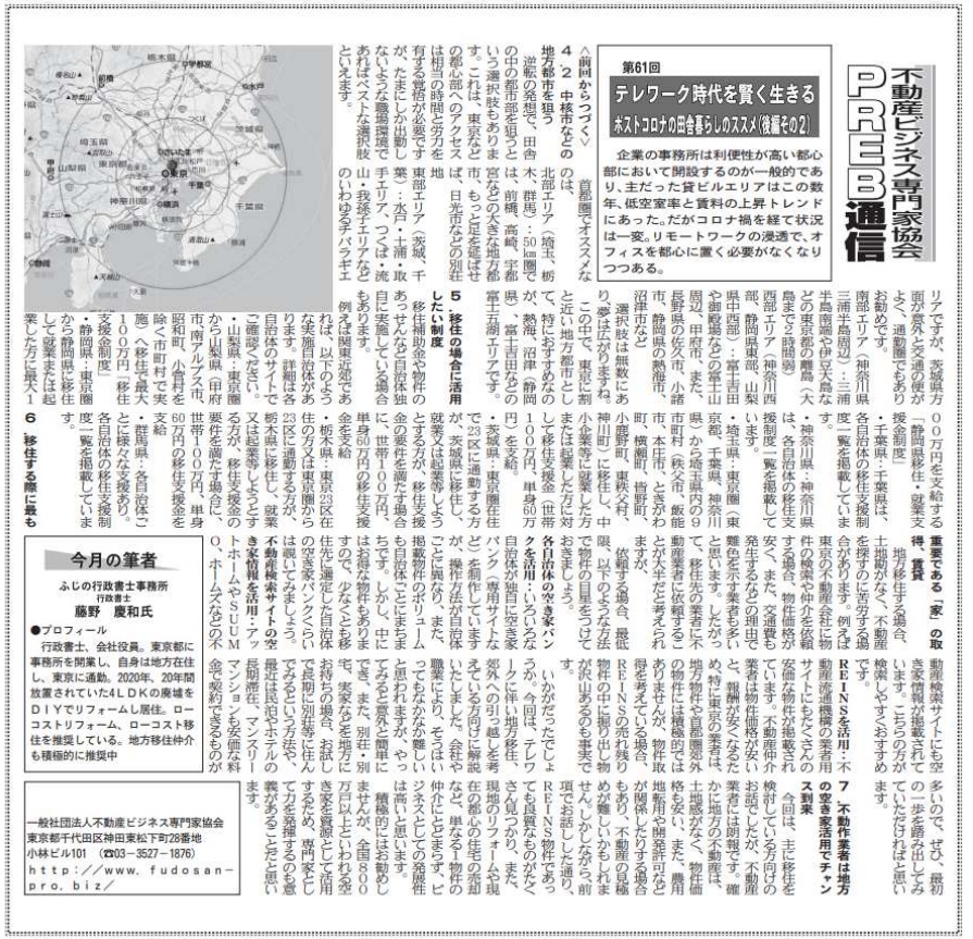 ビルオーナー、不動産会社向けの業界紙である「週刊ビル経営」にて、当協会登録専門家によるコラムを毎月連載させて頂いております。 今回は当協会登録専門家で行政書士の藤野慶和氏が「テレワーク時代を賢く生きるポストコロナの田舎暮… 続きを読む »