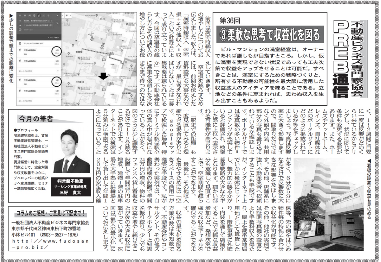 ビルオーナー、不動産会社向けの業界紙である「週刊ビル経営」にて、当協会登録専門家によるコラムを毎月連載させて頂いております。 今回は当協会登録専門家の三好貴大氏が「③柔軟な思考で収益化を図る」と題したコラムを執筆いたしま… 続きを読む »