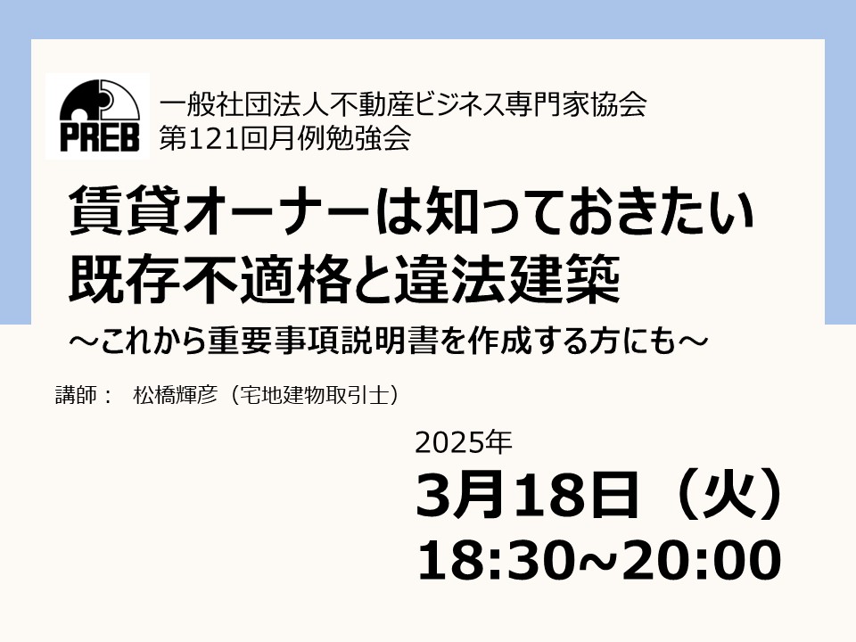 2025年3月に開催予定の第121回月例勉強会は、当協会登録専門家の松橋輝彦氏が「賃貸オーナーは知っておきたい既存不適格と違法建築」と題してお話します。 講演概要 建築基準法は昭和25年の制定以来、日本の経済成長や都市の… 続きを読む »