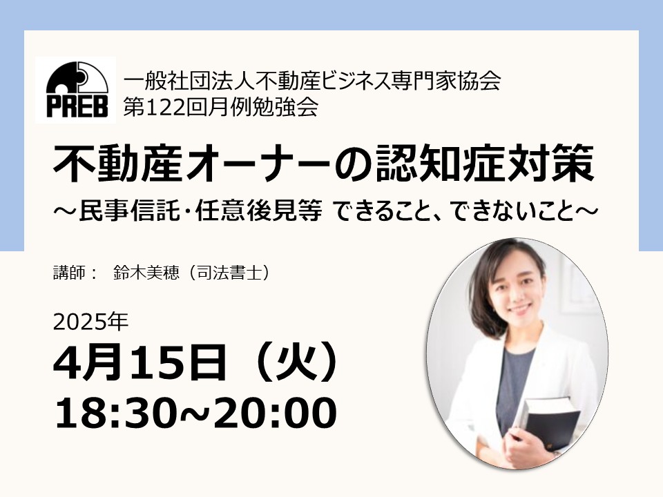 2025年4月に開催予定の第122回月例勉強会は、当協会登録専門家で司法書士の鈴木美穂氏が「不動産オーナーの認知症対策~民事信託・任意後見等 できること、できないこと~」と題してお話します。 講演概要 今回の勉強会では、… 続きを読む »