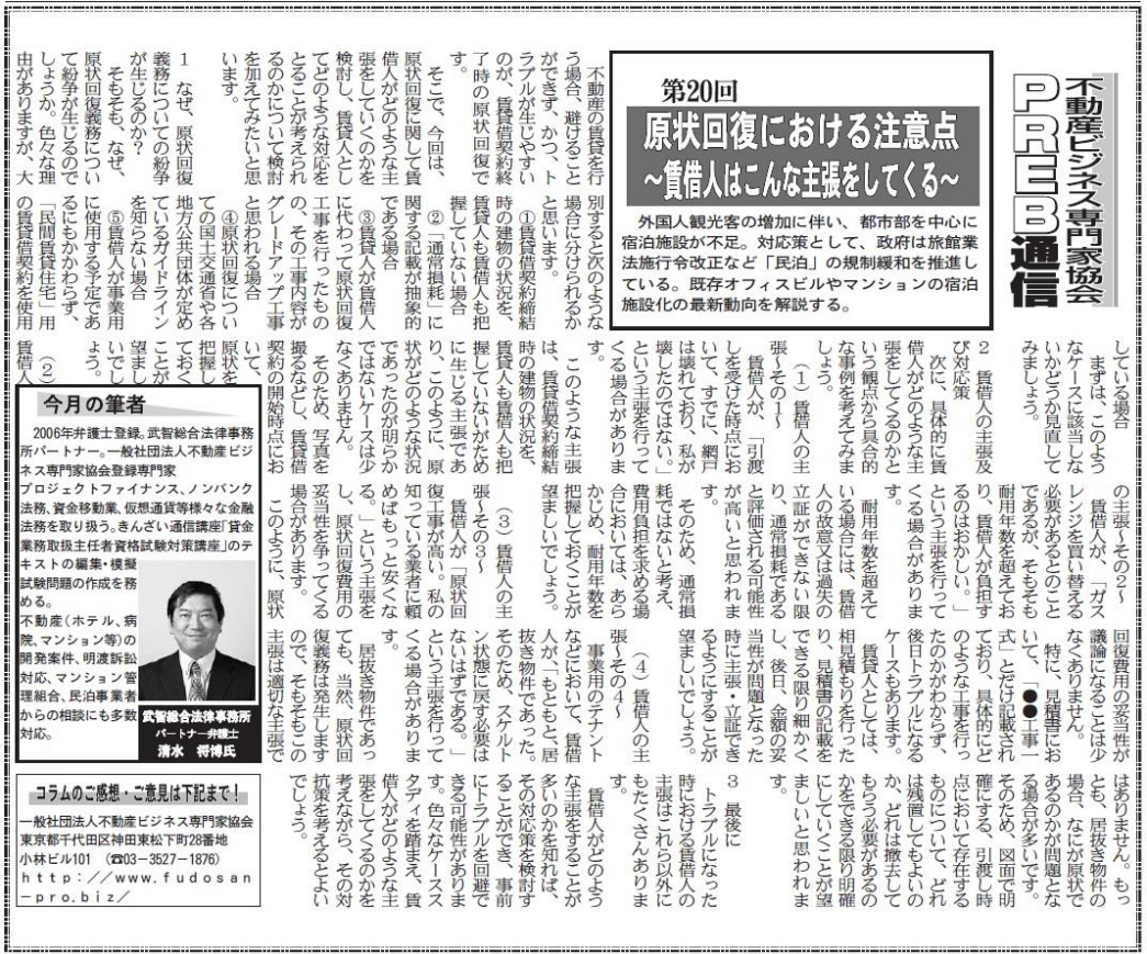 ビルオーナー、不動産会社向けの業界紙である「週刊ビル経営」にて、当協会登録専門家によるコラムを毎月連載させて頂いております。 今回は当協会登録専門家で弁護士の清水将博氏が「原状回復における注意点~賃借人はこんな主張をして… 続きを読む »