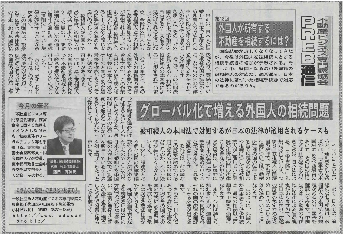 ビルオーナー、不動産会社向けの業界紙である「週刊ビル経営」にて、当協会登録専門家によるコラムを毎月連載させて頂いております。 今回は当協会登録専門家で行政書士の藤田育伸氏が「外国人が所有する不動産を相続するには?」と題し… 続きを読む »