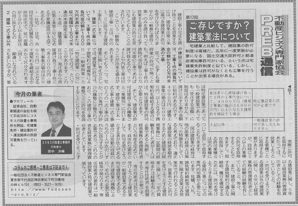 ビルオーナー、不動産会社向けの業界紙である「週刊ビル経営」にて、当協会登録専門家によるコラムを毎月連載させて頂いております。 今回は当協会登録専門家で行政書士の田中洋輔氏が「ご存じですか?建設業法について」と題したコラム… 続きを読む »