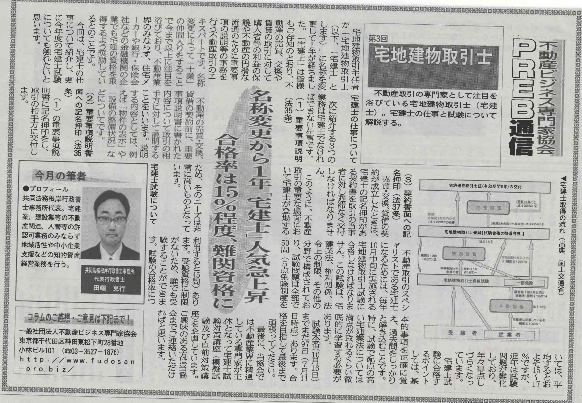 ビルオーナー、不動産会社向けの業界紙である「週刊ビル経営」にて、当協会登録専門家によるコラムを毎月連載させて頂いております。 今回は当協会登録専門家で行政書士の田端克行氏が「宅地建物取引士」と題したコラムを執筆いたしまし… 続きを読む »