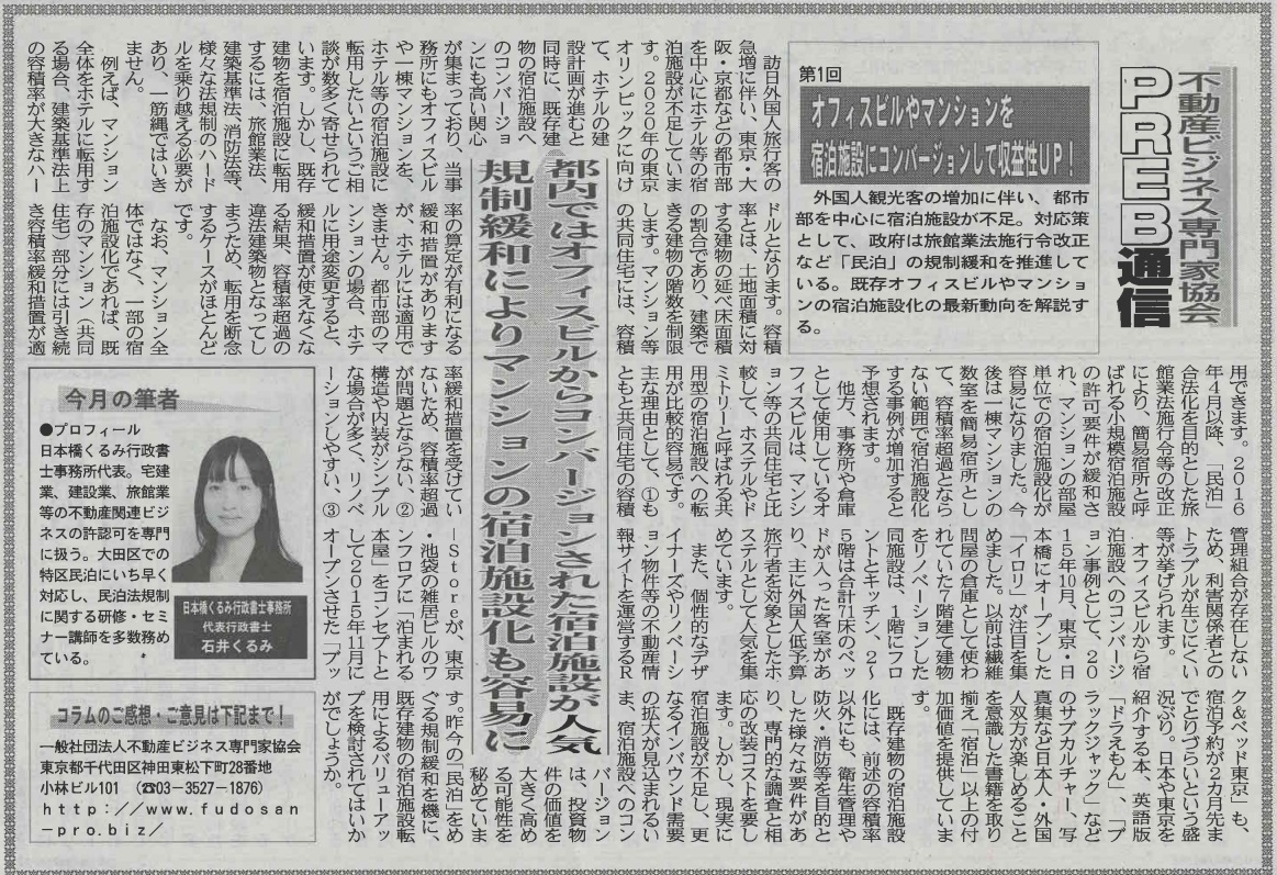 ビルオーナー、不動産会社向けの業界紙である「週刊ビル経営」にて、当協会登録専門家によるコラムを毎月連載させて頂いております。 今回は当協会登録専門家で行政書士の石井くるみ氏が「オフィスビルやマンションを宿泊施設にコンバー… 続きを読む »