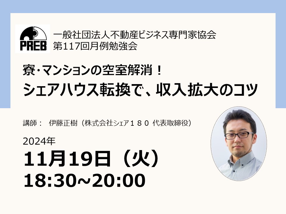 11月に開催予定の第117回月例勉強会は、株式会社シェア180代表取締役の伊藤正樹氏を講師としてお招きし、「寮・マンションの空室解消!シェアハウス転換で、収入拡大のコツ」と題してお話して頂きます。 講演概要 今回の勉強会… 続きを読む »
